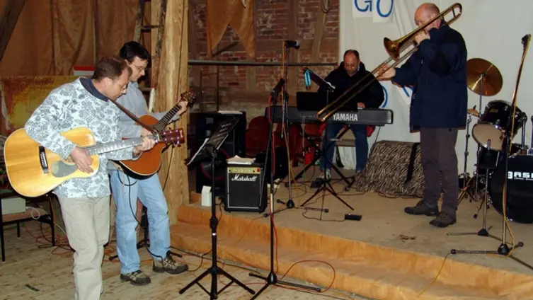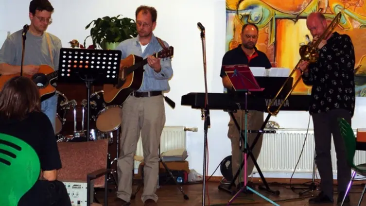 Wir proben jeden Freitag im Bandkeller der Gemeinde.